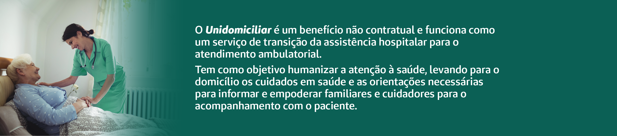 • Não estar em período de carência; • Contratação em pré-pagamento; • Possuir perfil de elegibilidade segundo a tabela de classificação de complexidade da Unimed Brasil (mais de 10 pontos) e possuir um estado geral que permita que o tratamento seja realizado em ambiente domiciliar; • NÃO se encontrar em carência e/ou CPT (Cobertura Parcial Temporária) / doença preexistente; • Residir na área de abrangência do serviço: GOIÂNIA, APARECIDA DE GOIÂNIA e SENADOR CANEDO; • Consentimento formal do paciente ou responsável legal por meio da assinatura do TERMO DE COMPROMISSO; • NÃO residir em: Instituições de longa permanência, abrigos, creches ou outros ambientes não domiciliares; • Ter um cuidador em domicílio responsável pelo paciente 24 horas.
