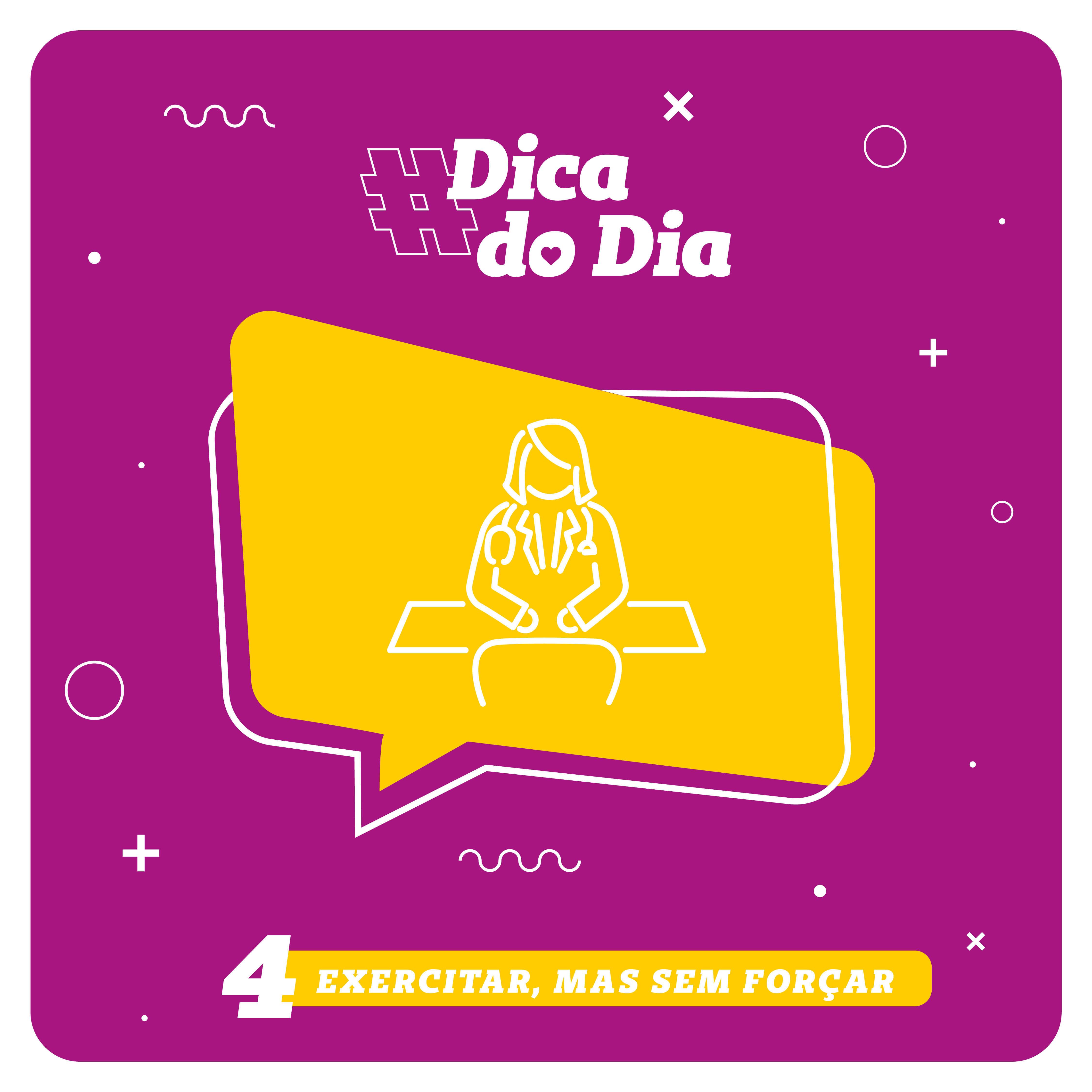 DICA 4. EXERCITAR, MAS SEM FORÇAR. Se você já está acostumada a se exercitar, o mais provável é que possa continuar com a mesma atividade de sempre. Mas é bom conversar com o profissional que orienta seu treino para que vocês possam chegar numa combinação que te deixe confortável e seja eficiente. Só não vale forçar a barra, tá?